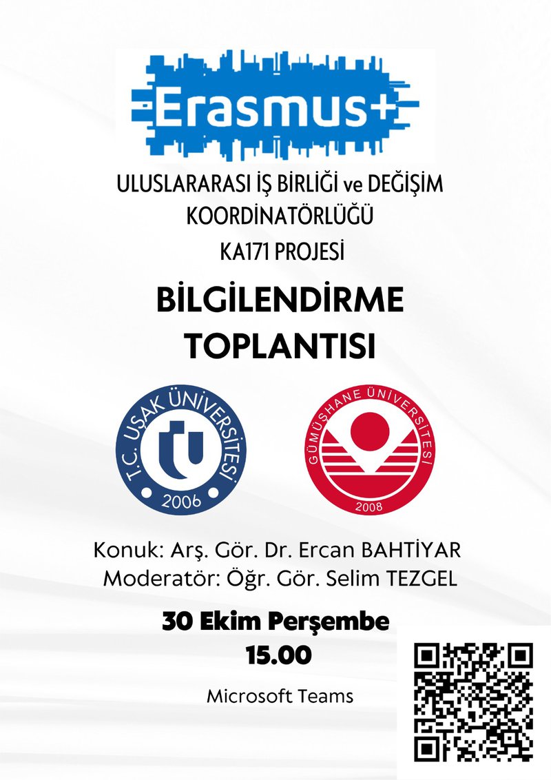 Üniversitemiz tarafından yürütülen Erasmus+ KA171 Proje türü kapsamında proje süreci, mevcut iş birliği fırsatları ve yeni uygulamalar hakkında bilgilendirme yapmak üzere bir çevrim içi (microsoft teams) toplantı düzenlenecektir.